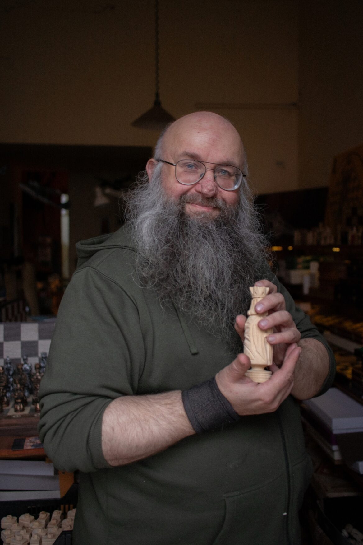 Tak, to prawda. Obecnie często zdarza się nawet, że ludzie przechodząc obok zerkają do środka i widzą szachy i mnie rzeźbiącego przy wejściu do pracowni. Wtedy czasem mijają drzwi pracowni a po chwili cofają się i znów zaglądają – czasami zaciekawieni wchodzą też do środka.